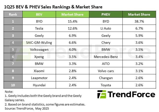 Tesla also faces some challenges. And it is also losing share. China’s BYD maintained its lead over Tesla in EV sales during 1Q25, claiming the top spot with a 15.4% market share, while Tesla followed with 12.6%, according to TrendForce (See chart below).