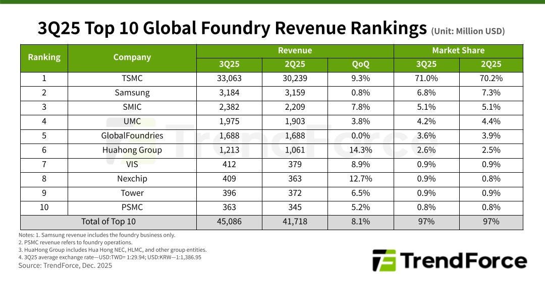 In the overall foundry business, TSMC’s market share reached 71% in the third quarter of 2025, up from 70.2% in the second quarter, according to TrendForce, a market research firm. In the third quarter, Samsung, UMC and GlobalFoundries slightly lost share. HuaHong Group and Nexchip gained share.